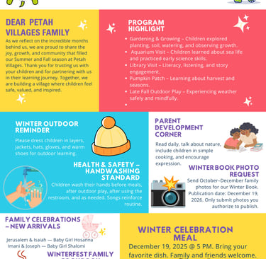 The Petah Villages is a child-centered program dedicated to nurturing the comprehensive development of every child. We adhere to the philosophy that holistic development is facilitated by the collaboration of three essential teachers: parents, educators, and the child's environment. By fostering interactions among these influencers, we aim to support children in their emotional, social, cognitive, spiritual, and physical growth. Through a blend of outdoor and indoor experiences designed to promote holistic development, we strive to equip both children and their families with skills that contribute to lifelong personal and interpersonal development.
